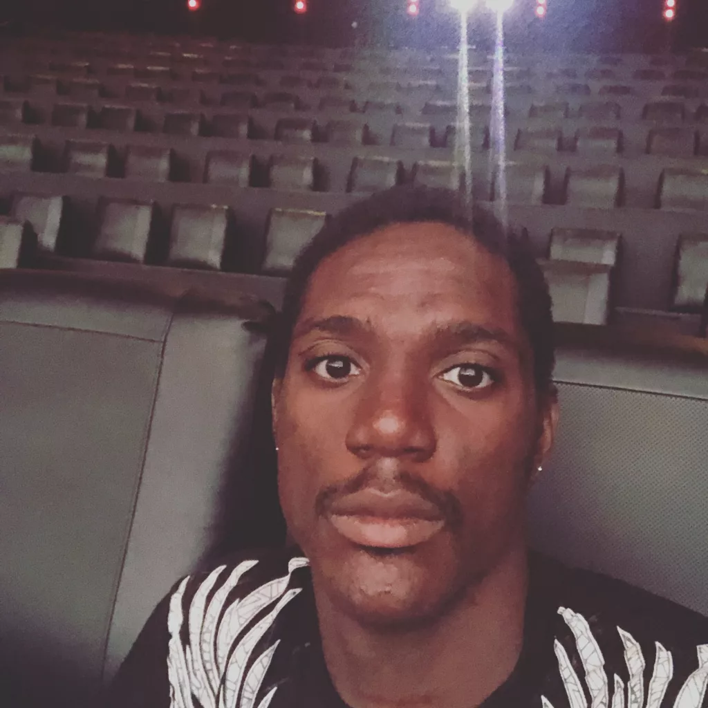 K. Bo24 in a black t-shirt standing outdoors, looking thoughtful with a hand on his chest.